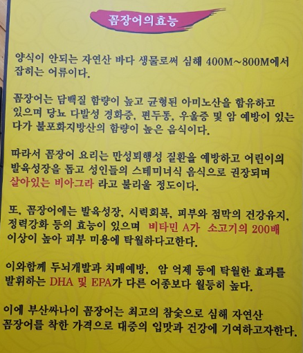 꼼장어는 고단백 식품으로 기력을 회복시켜 주고 불포화지방산이 포함된 오메가 3은 나쁜 콜레스테롤 수치를 낮춰 혈관질환 예방에 효과적입니다. 또한, 칼슘, 철분, 인이 골밀도 향상에 도움을 주고 어린이 성장발육에 효과적입니다.